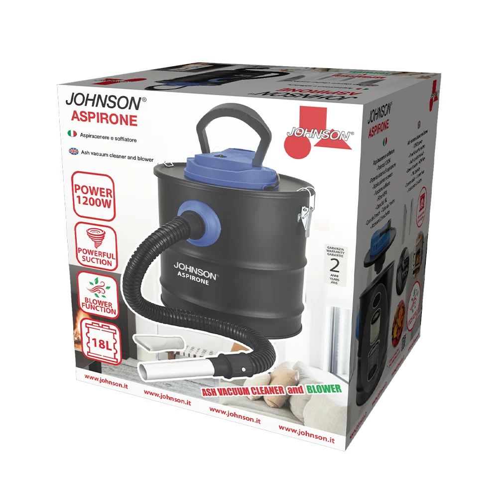 ASPIRONE, di JOHNSON, è un aspirapolvere potente da 1200 W, ideale per aspirare polvere, cenere e detriti.