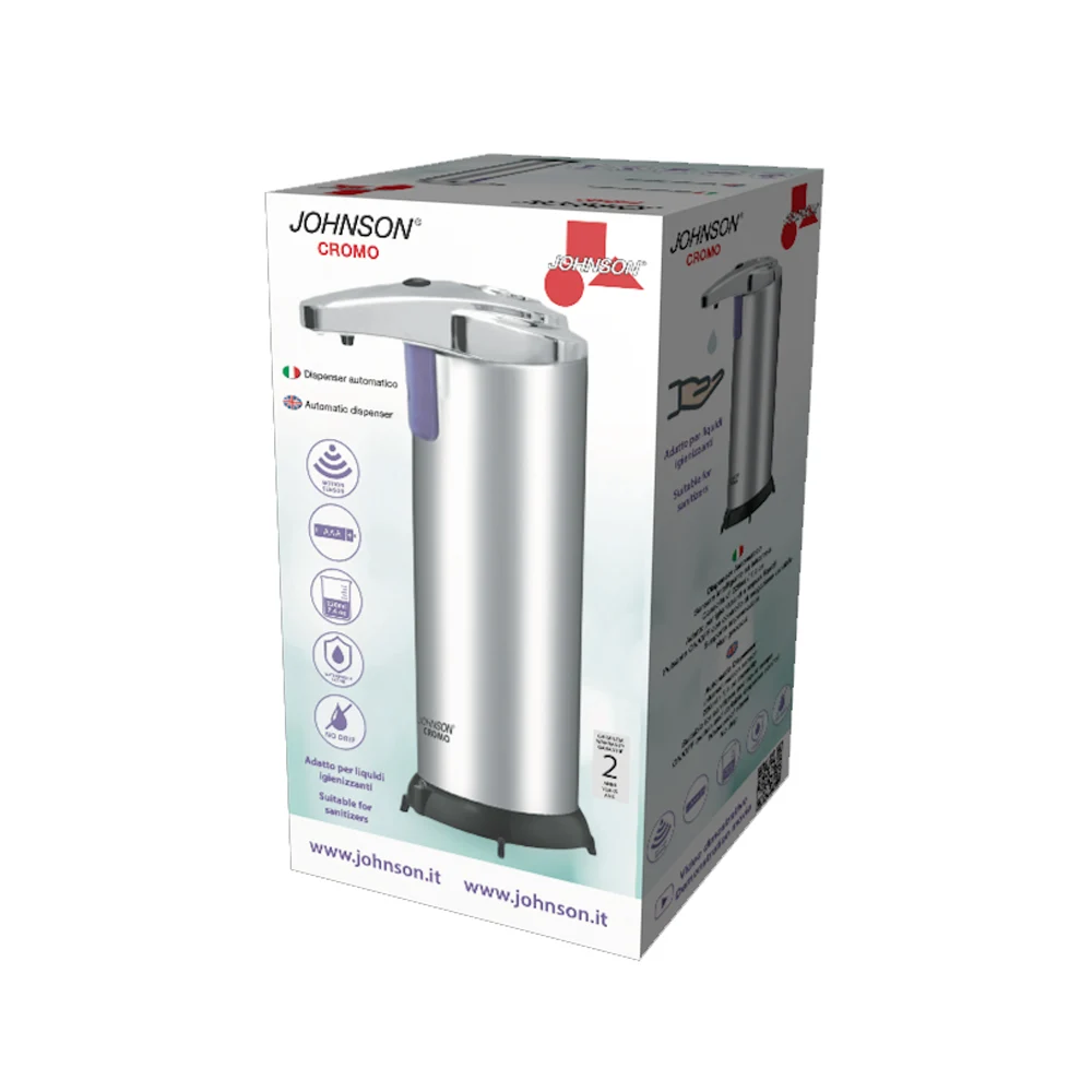 CROMO di JOHNSON è un dispenser automatico di sapone o igienizzante con sensore a infrarossi che rileva le mani.