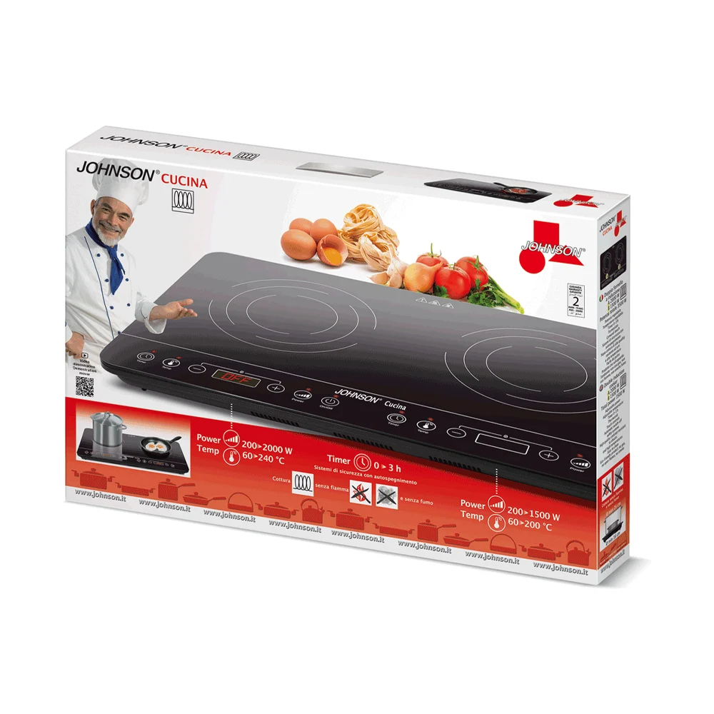 CUCINA di JOHNSON è una pratico piastra a induzione a due zone, con una potenza massima di 2800 W.
