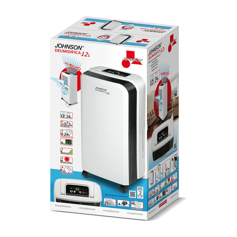 DEUMIDIFICA 12L è il deumidificatore d’aria JOHNSON che rimuove fino a 12 litri di umidità al giorno, migliorando il comfort dell’ambiente in ogni stagione.