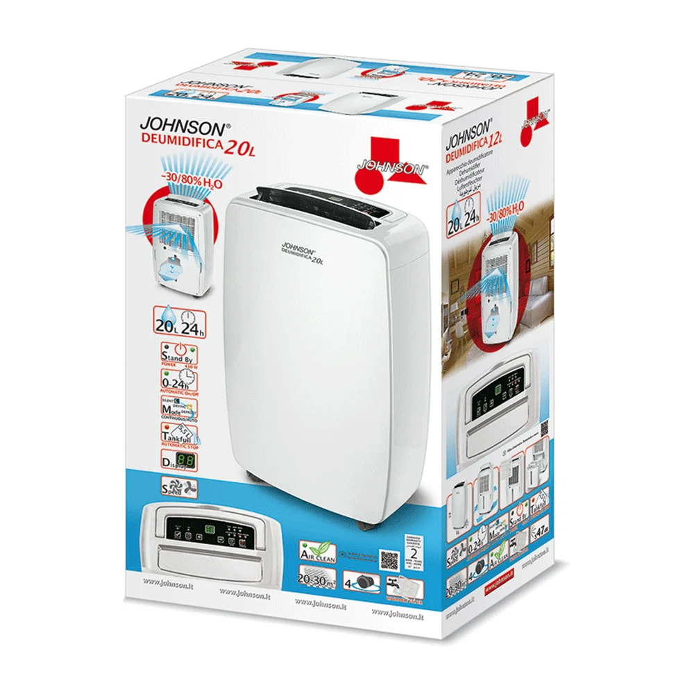 DEUMIDIFICA 20L è il deumidificatore d’aria JOHNSON che rimuove fino a 20 litri di umidità al giorno, migliorando il comfort dell’ambiente in ogni stagione.