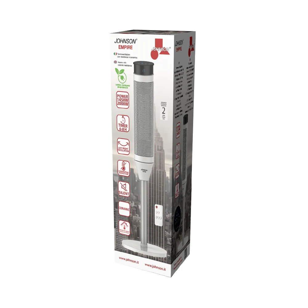 EMPIRE di JOHNSON è il termoventilatore in ceramica ideale per riscaldare velocemente la casa con un design moderno ed elegante.