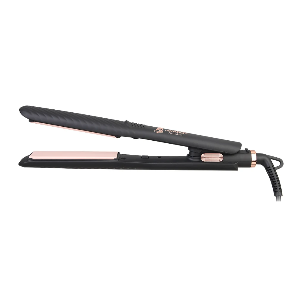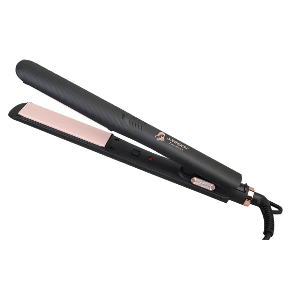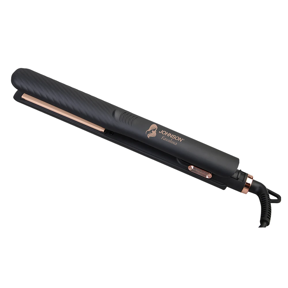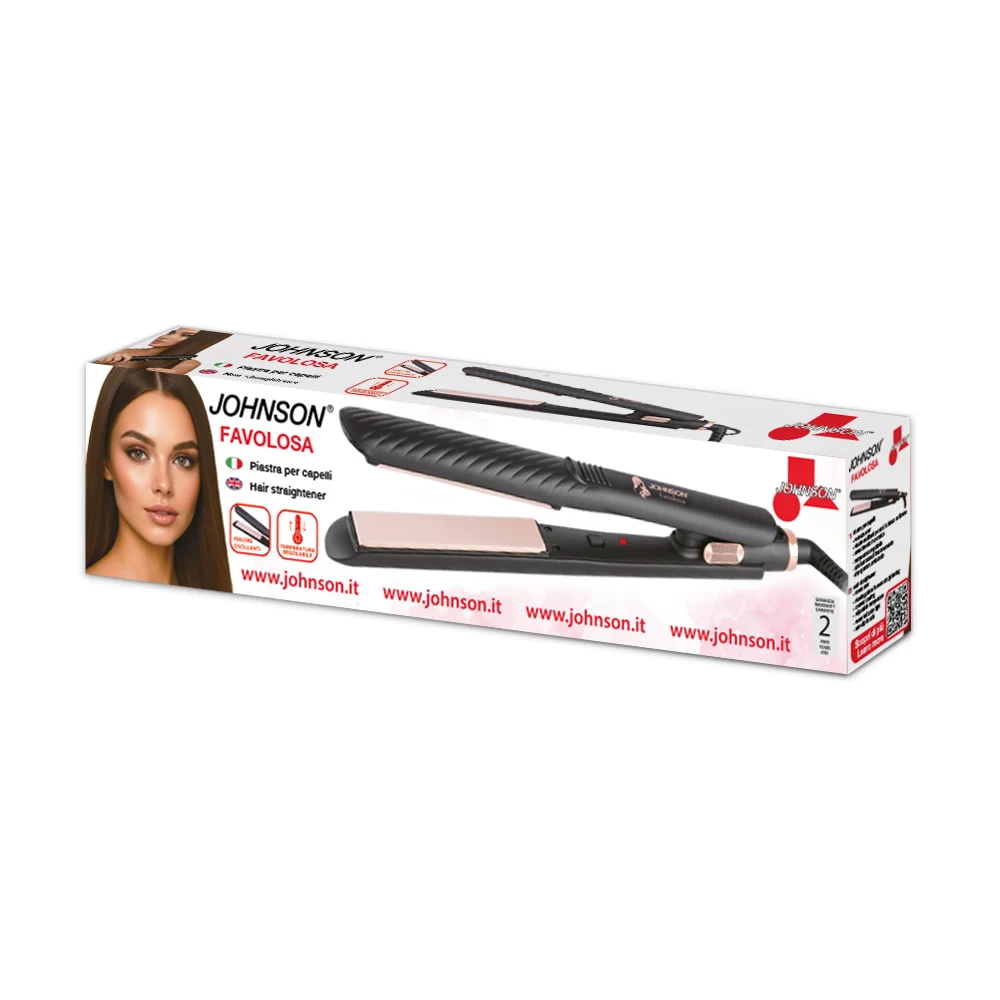 FAVOLOSA di JOHNSON è la piastra lisciante dal design elegante nero con dettagli oro rosa, ideale per ottenere capelli lisci, setosi e brillanti.