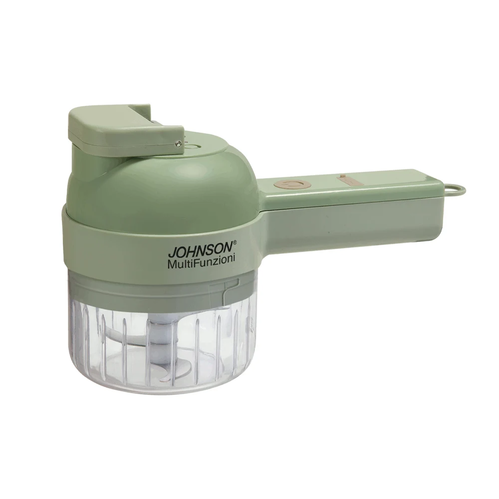 Con il suo elegante colore verde e gli accessori inclusi, MULTIFUNZIONI affetta, trita, sbuccia e sbatte.