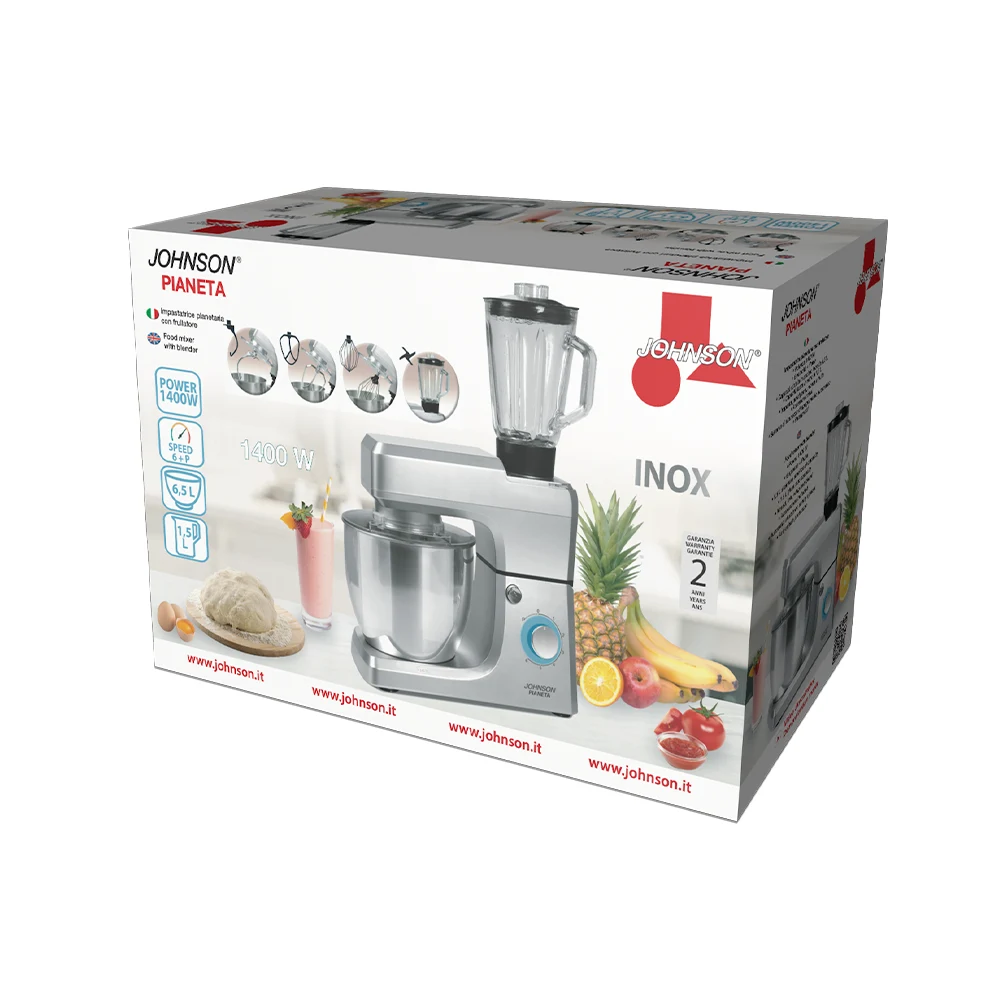 PIANETA di JOHNSON è la impastatrice planetaria con frullatore ideale per trasformare ogni ricetta in un trionfo di gusto. Semplice da usare e versatile, ti permette di preparare facilmente ogni tipo di piatto, dai menù elaborati al pranzo di tutti i giorni.