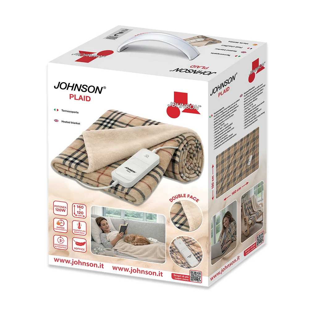 Con una potenza di 120 W, Plaid si riscalda rapidamente distribuendo un tepore uniforme e piacevole.