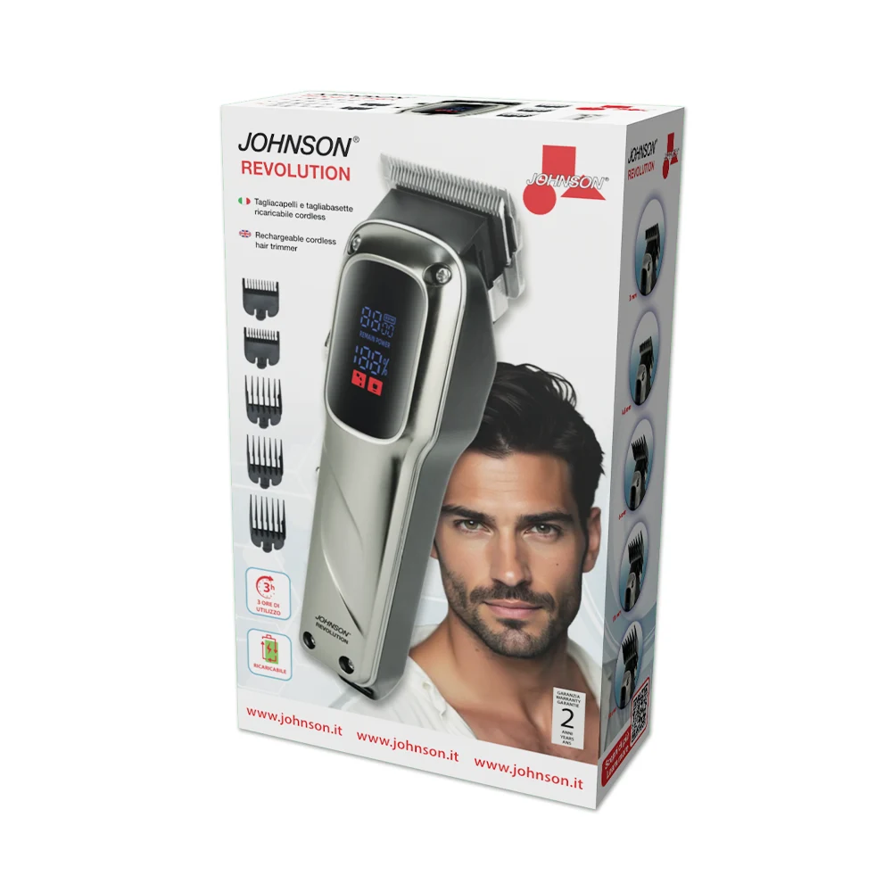 REVOLUTION di JOHNSON è il tagliacapelli e tagliabasette elegante e compatto. Design raffinato per un look sempre curato.