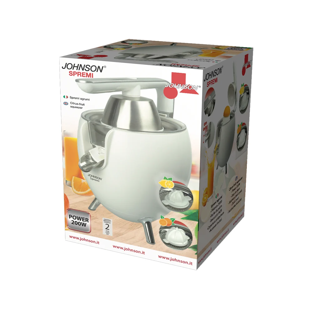 SPREMI di JOHNSON è lo spremi agrumi elettrico perfetto per avere a casa succo sempre fresco e naturale, senza coloranti o aromi aggiunti. Ideale per spremere arance, limoni, mandarini e pompelmi, garantisce un risultato genuino ogni giorno.