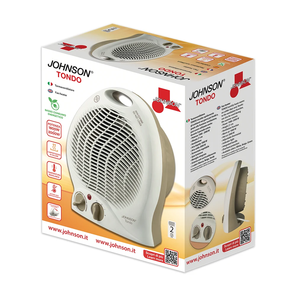JOHNSON TONDO è un termoventilatore compatto e funzionale, ideale per l’uso quotidiano in casa. Inoltre, offre due livelli di potenza selezionabili, 1000 e 2000 W, per adattarsi facilmente a ogni esigenza.