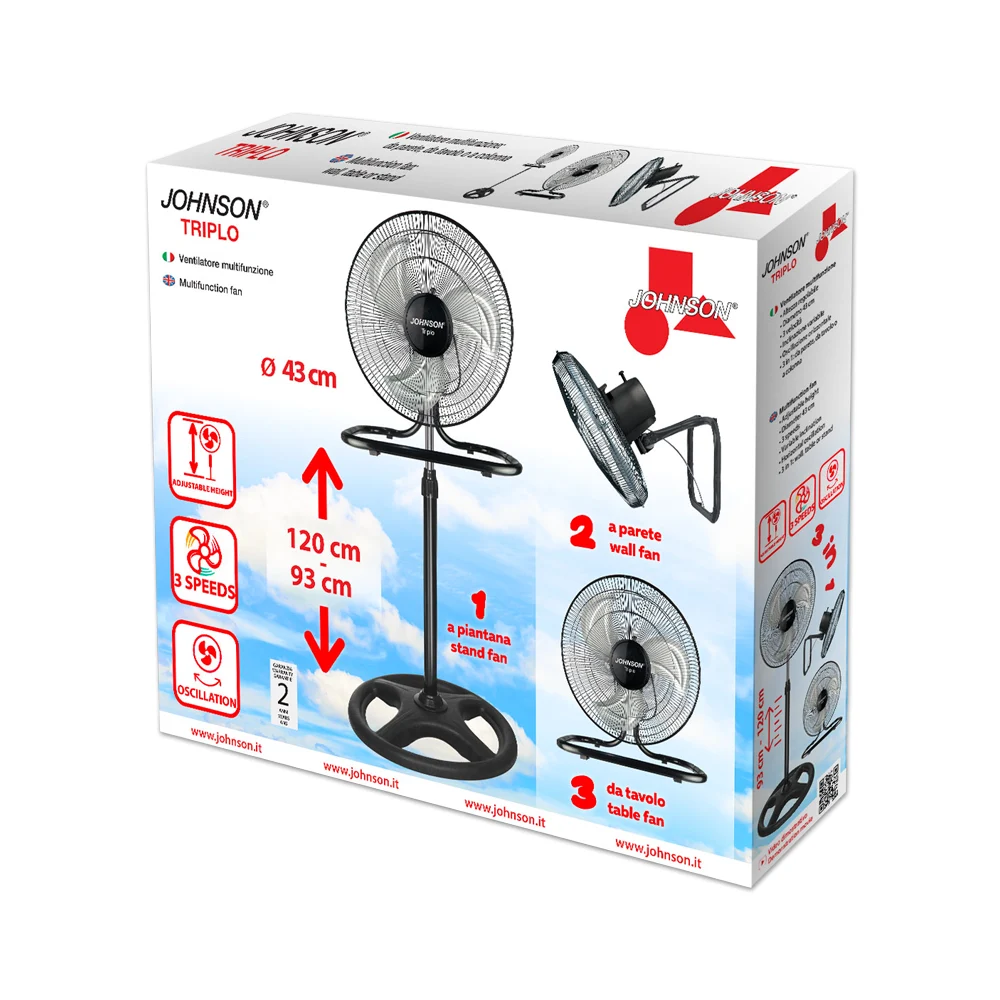 TRIPLO di JOHNSON è il ventilatore multifunzionale 3 in 1, utilizzabile come ventilatore da colonna, da tavolo o da muro. La sua versatilità lo rende perfetto per qualsiasi ambiente.