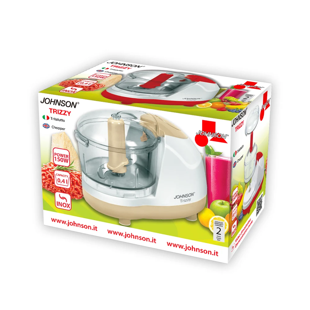 TRIZZY di JOHNSON, con potenza di 150 W, è il tritatutto compatto perfetto per preparare velocemente battuti e tritati.
