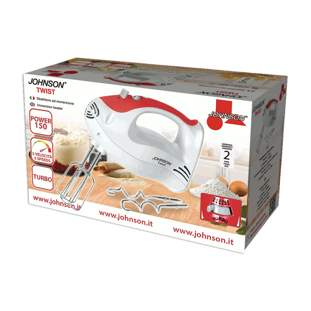 TWIST di JOHNSON è uno sbattitore elettrico ideale per amalgamare, miscelare, sbattere e impastare in modo rapido e preciso. Pensato per l’uso domestico, è perfetto per preparare dolci, impasti e creme con facilità.