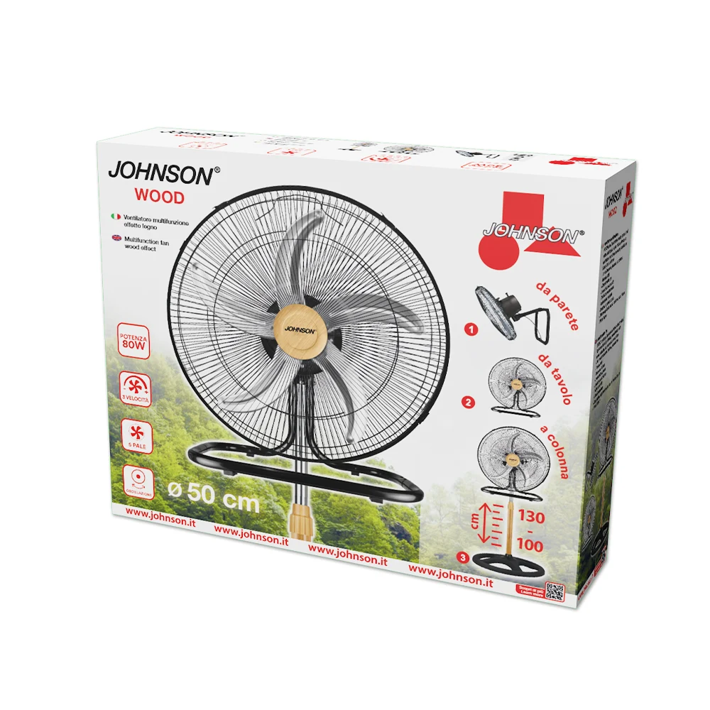 WOOD di JOHNSON è il ventilatore multifunzionale 3 in 1. Dal design elegante con elementi effetto legno, perfetto per ogni ambiente. Può essere utilizzato in tre modalità: da parete, da tavolo o a colonna, adattandosi facilmente alle tue esigenze.